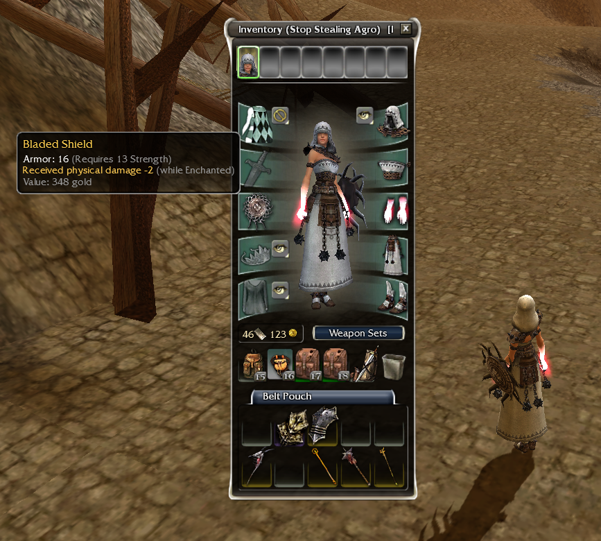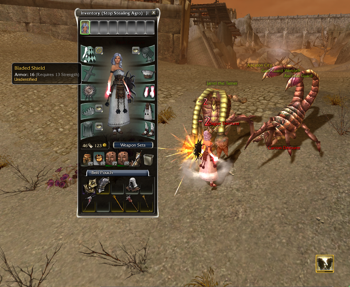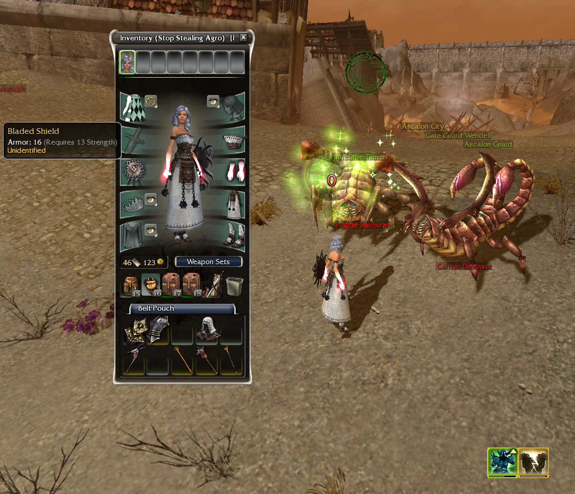 Here I have an unid bladed shield. I've taken my head armour off so I take some physical damage. As you can see I'm taking 2 damage from these little devourers - perfect.