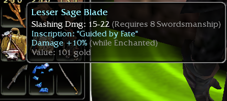 Thanks Hyndzy! I've seen q8 blue max inscr. swords go for around 100e, but that was a few years back and it was a Fiery Dragon Sword skin. Don't know how much it's worth these days.