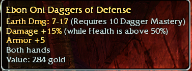 OWN-1: +5e q9 Oni Blade SOLDOWN-2: 15^50 q10 Oni Blade SOLDOWN-4: 15^50 q9 Oni Daggers SOLDPLG-1: q9 Tact Plagueborn Shield +10 vs Earth -2 (ench): SOLDPLG-4: +5 energy q9 Plagueborn Sword SOLDq9, 10, 11, 12, 13, 15^50 Plagueborn Sword Collection. SOLD