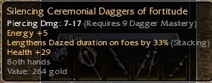 Ceremonial also drops as INSC, which is notorious for NUKING os values (thanks anet) :). +5 on daggers isn't really the best mod, best are 15^50, 15%-e regen, 15%-health regen. +5 on a sword/axe low req OS only skin is generally bank.