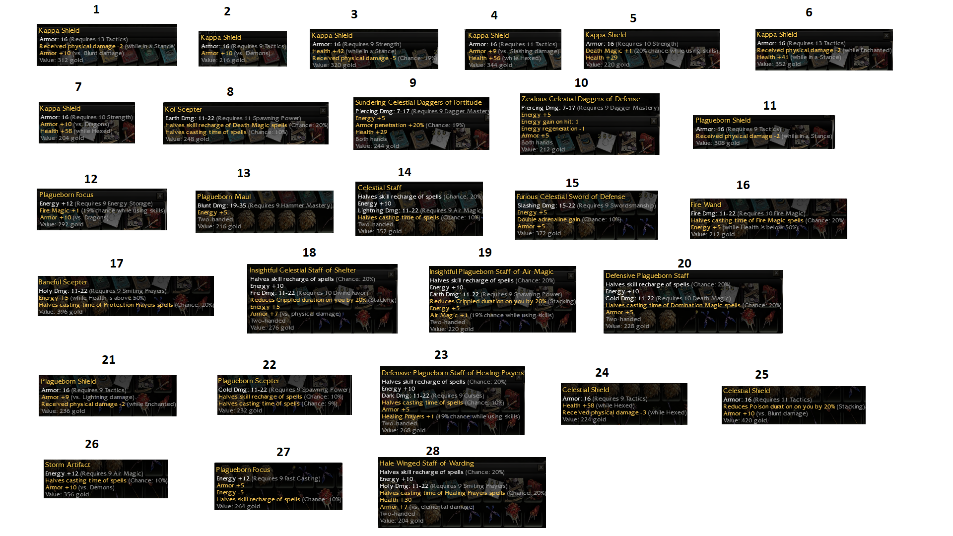 Hey! WTS these items, kappa shields, some plagueborn and celestial weapons. There are no b/o-s, I'll accept highest bid afer few days.