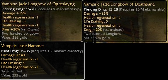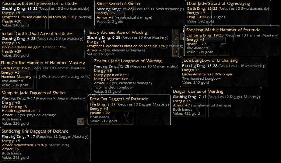 OS Shields, offhands, +5en weapons, dual vamp, q9 insc., some greens and +1 wraps
