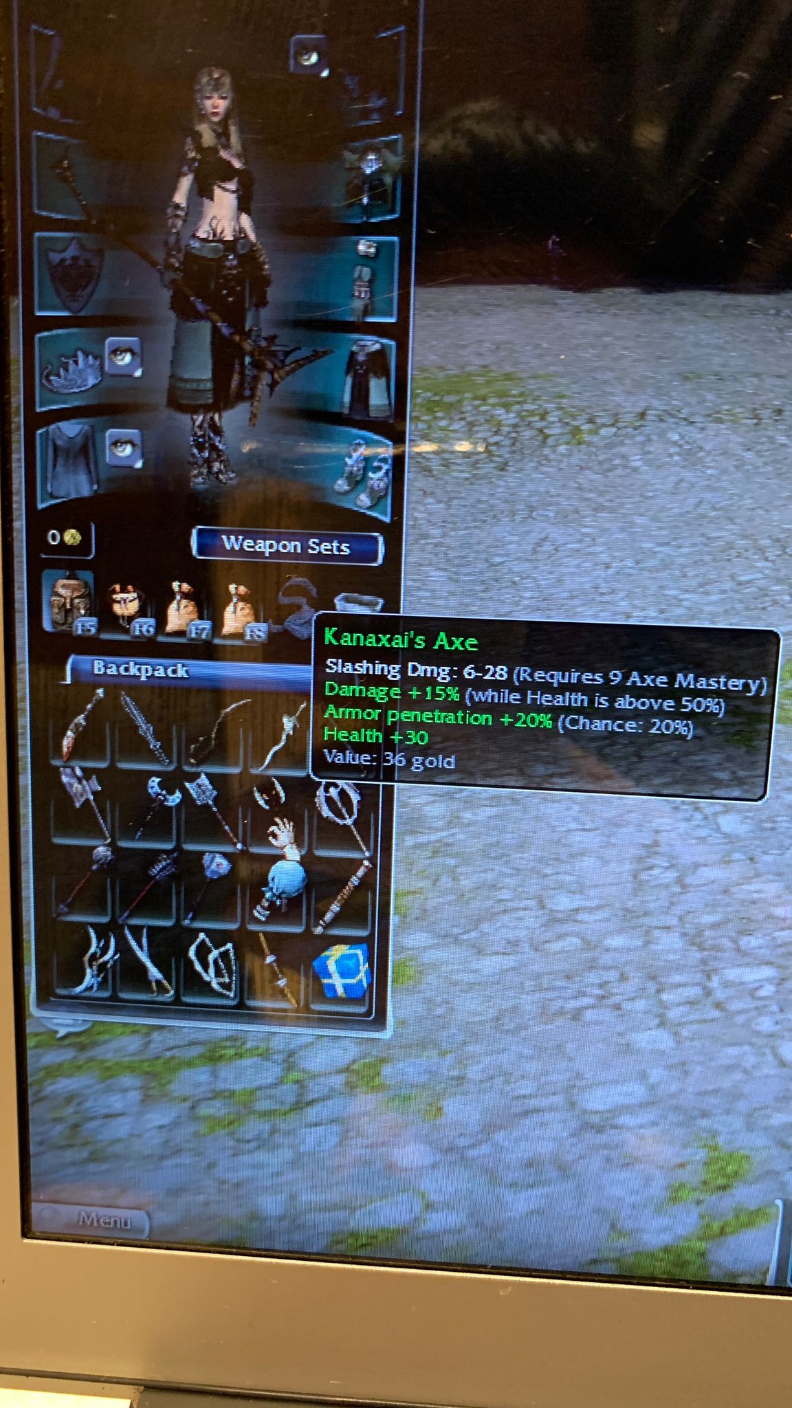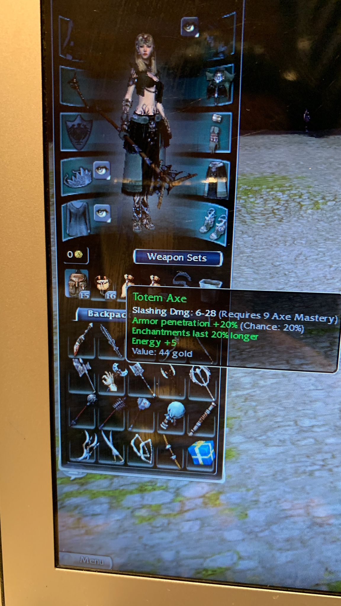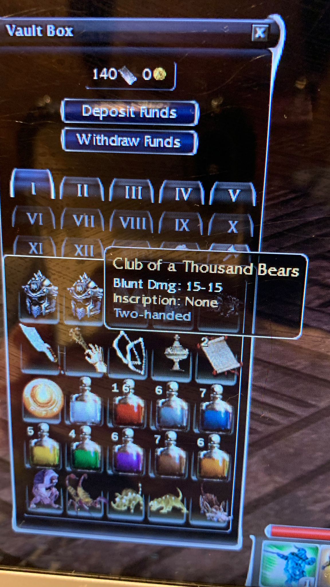 I’m gonna buy more storage space, play the game a little and continue with taking more pics of axes, wands, staffs, greens, off-hands etc...