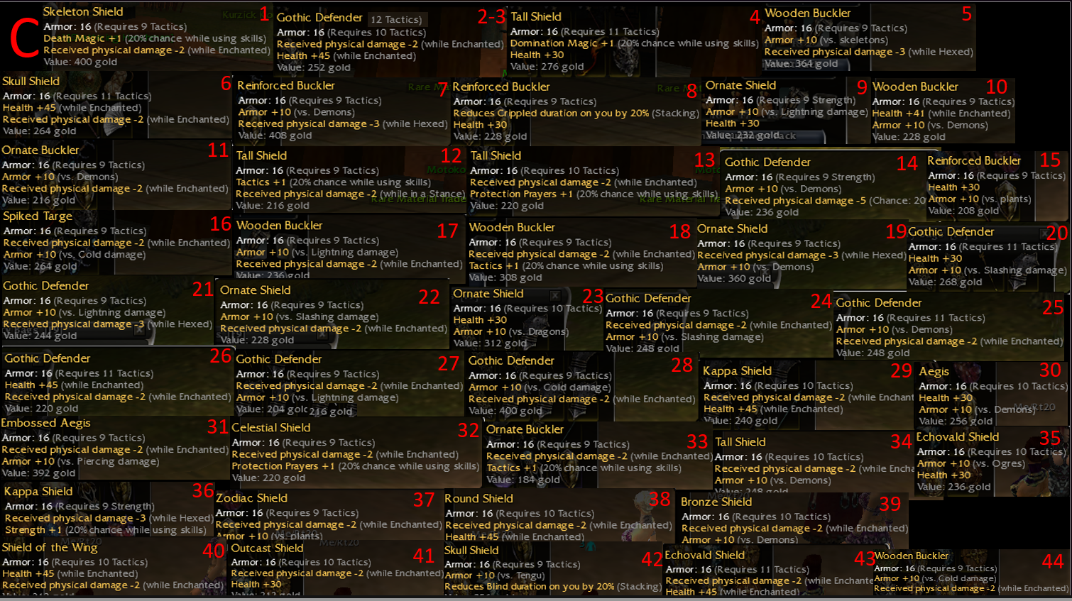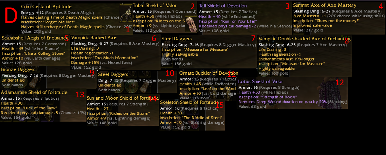 Arm pricing 1a=50e if paying in ecto. Q7 kaineng and q7 scimitar are max for req, anything higher is prenerf.