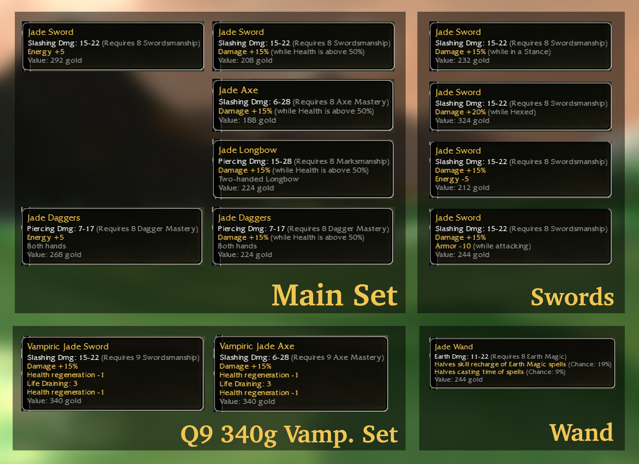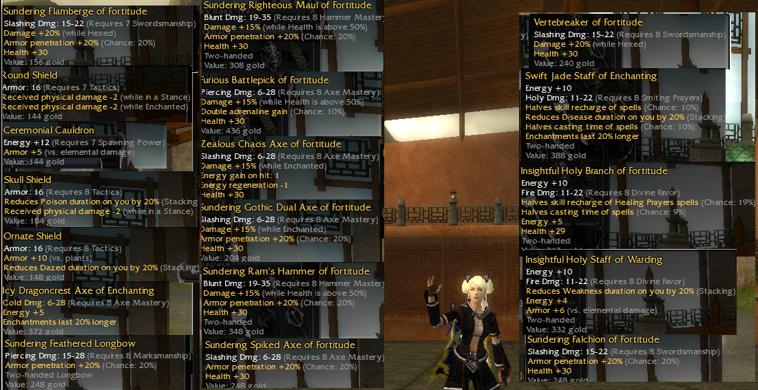 I'm sure many are wondering how much it was, so i think its just better say here then answering all the pm's. It was trade where i had to let go many of my favorite items, crucial parts of my collection including set of various q8 +5e weapons, some of my best wands, offhands and shields in guildwars and armbraces, totalling to ~800-900armbraces value.