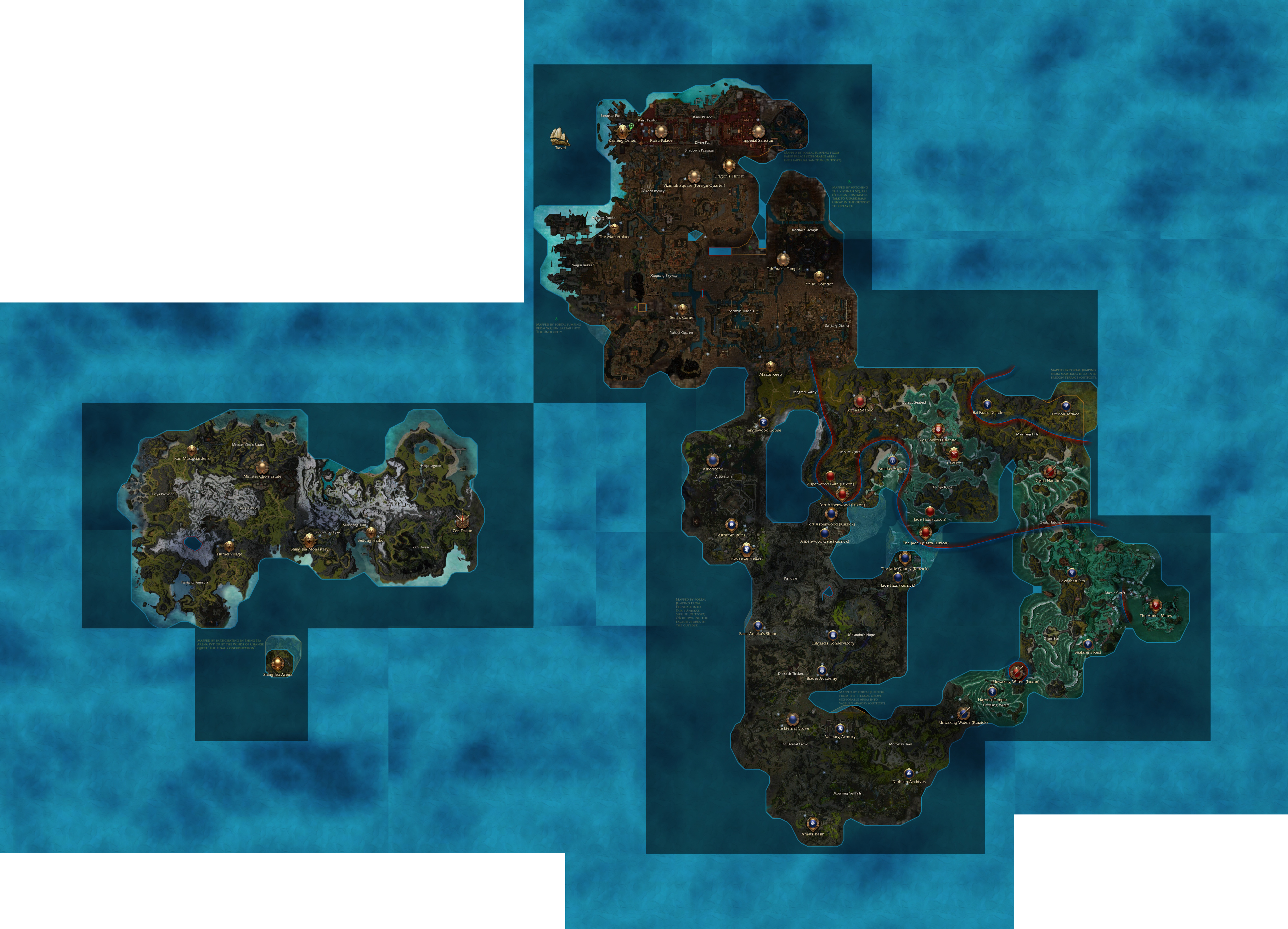 Summary: Kaineng -> Maatu Keep -> Boreas Seabed -> Zos Shivros Channel -> Breaker Hollow -> Gyala Hatchery (1000xp) -> Leviathan Pits -> Unwaking Waters (Luxon) (1000xp) -> Harvest Temple -> Raisu Palace -> Imperial Sanctrum -> Divine Path.