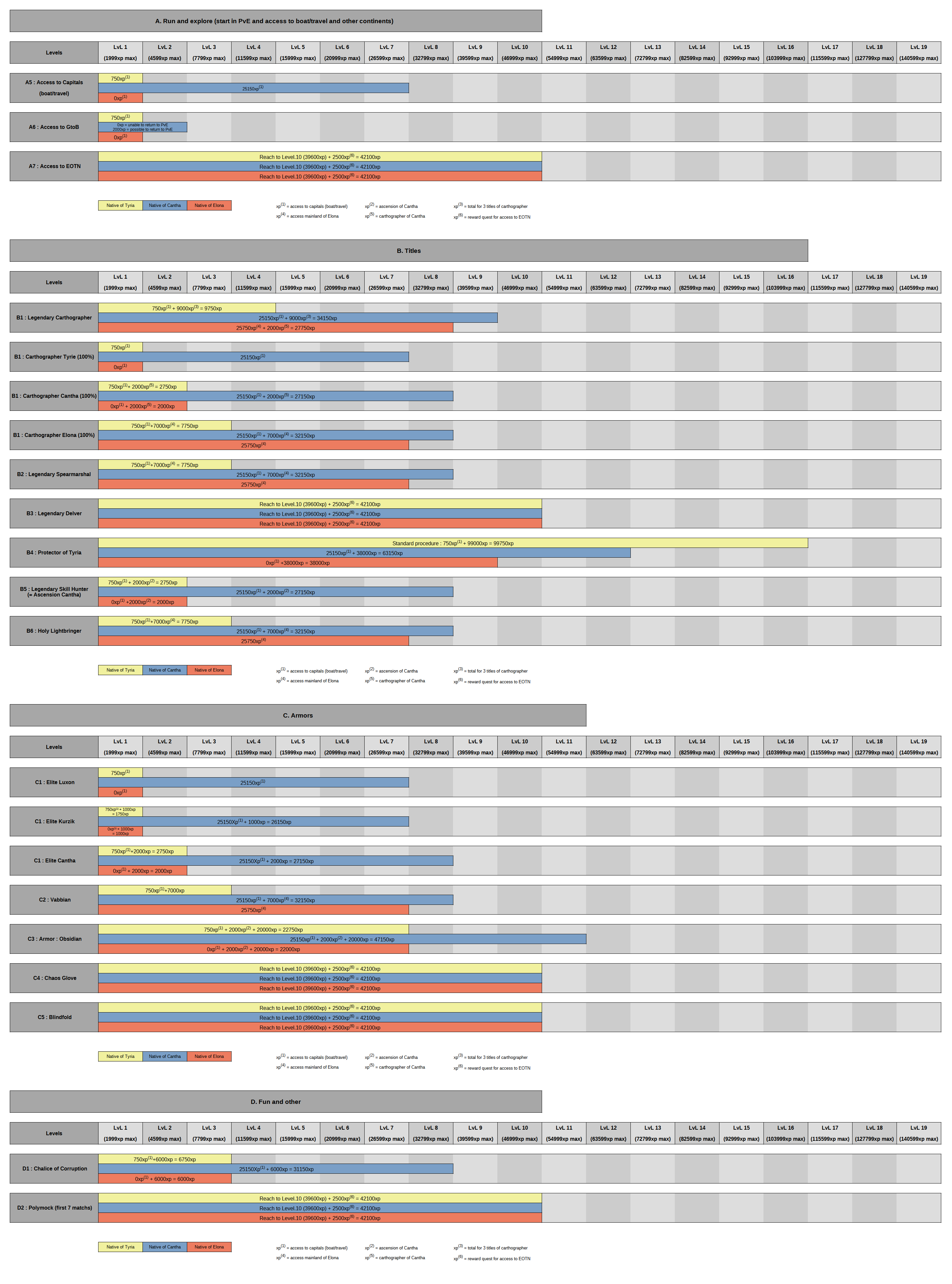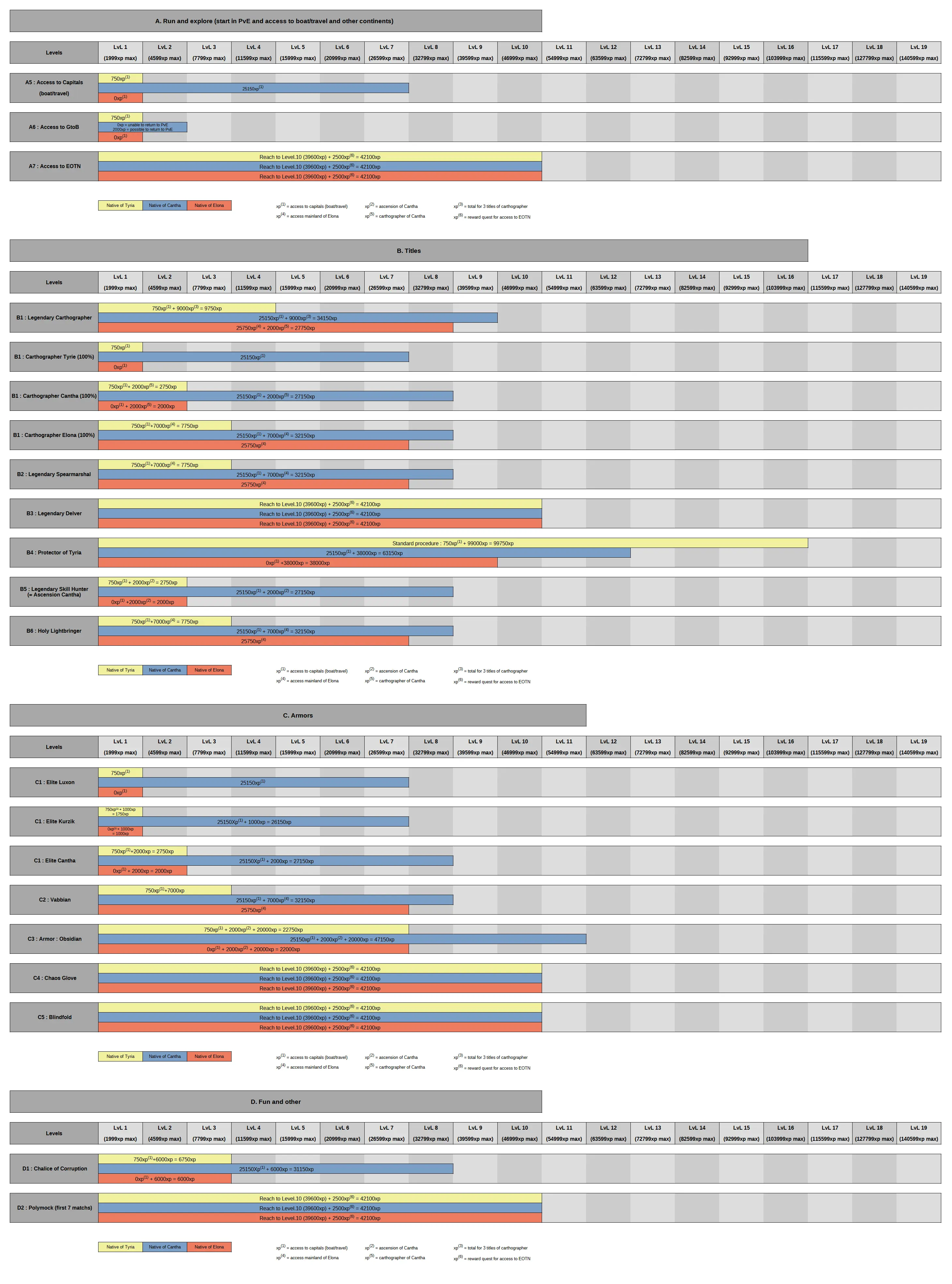 The purpose of this tutorial is to obtain various elements in Guild Wars with the minimum amount of xp required. I have listed all the quests, with links to the official wiki. I have also included the required xp gains. The goal is to have a directory of these items and an equally effective overview. A summary table also shows the comparisons and differences between the native characters of the three campaigns.