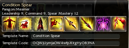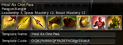 Two: OwIT0YIjHyLa6rBkkIHE07uE5AA (I am using Infuse Health over Dwayna's Kiss here, but feel free to use whichever. I prefer the emergency heal spike more)