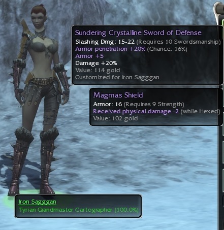 During all her time roaming Tyria and Cantha she was able to aquire some pretty sick stuff and to this day probably remains the best equipped Iron Char I have. Also sporting a sweet superior Vigor rune.