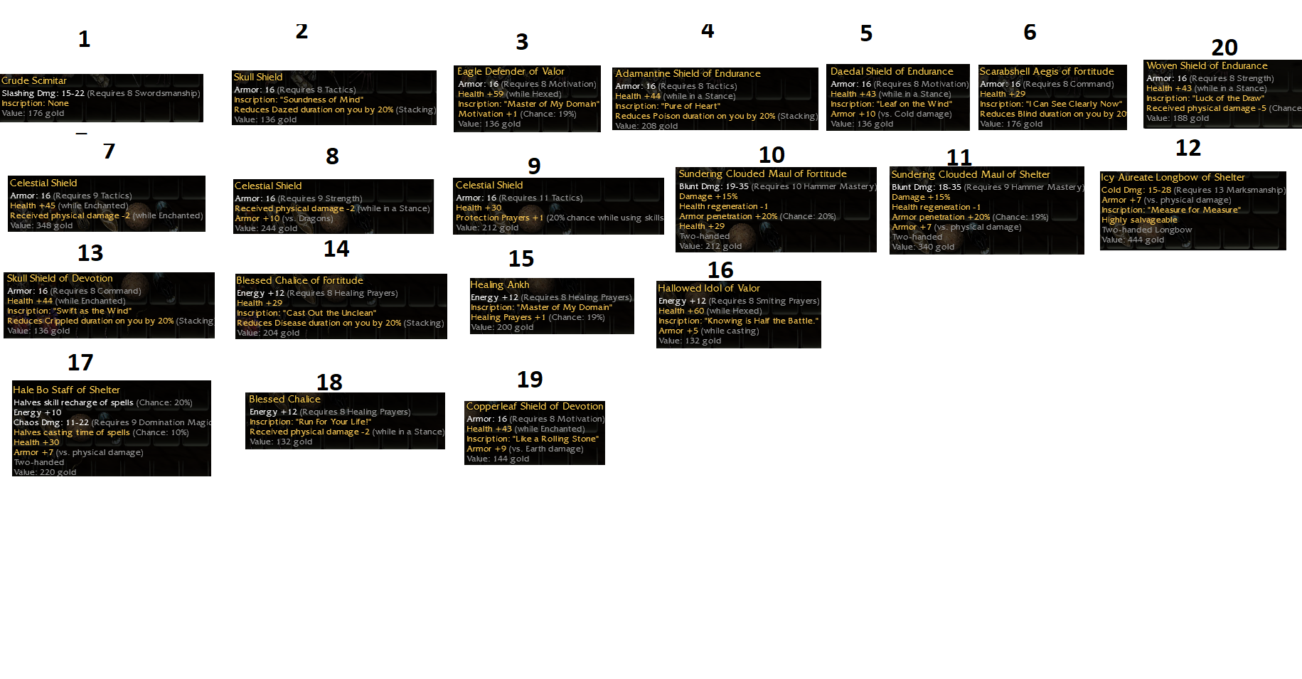 Hey! WTS these os /insc items. You need to know the first line ( #1-6 & #20) was not farmed by me, those came from a random guy who offered them for a future giveaway. So i can't tell whether they were legit farmed or botted... my guess is the latter, Moddok maybe? Nonetheless I know they will be sought after, especially the q8 crude scimitar. Good luck!