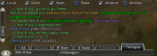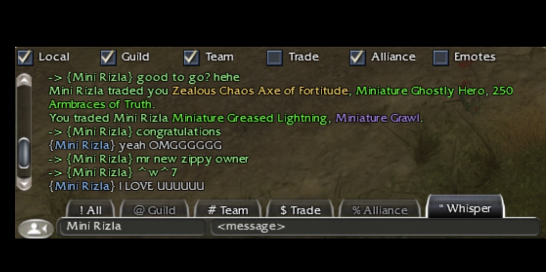 Meanwhile Kamadan AE a bunch of "grown up" is argueing about virtual items and a "market" in a 18y old game and is bringing their meaningless exchange of tears that wont lead to any result to legacy. Please continue your braindead shit conversations in Kama.
