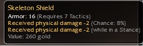 Welcome. I have here a Req 7 Armor 16 dual -2 -2 Skeleton Shield up for possible Auction. As the stats say, -2 (8%) -2 stance. The rarity of this shield cannot be understated and it's unlikely something like this will pop up again for a long time. I intend for this thread to be up for awhile unless a very strong offer comes in. I reserve the right to not sell the shield.