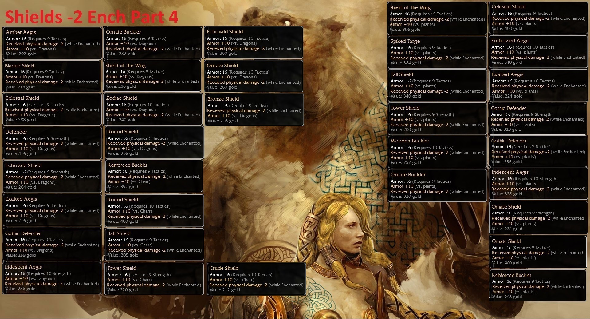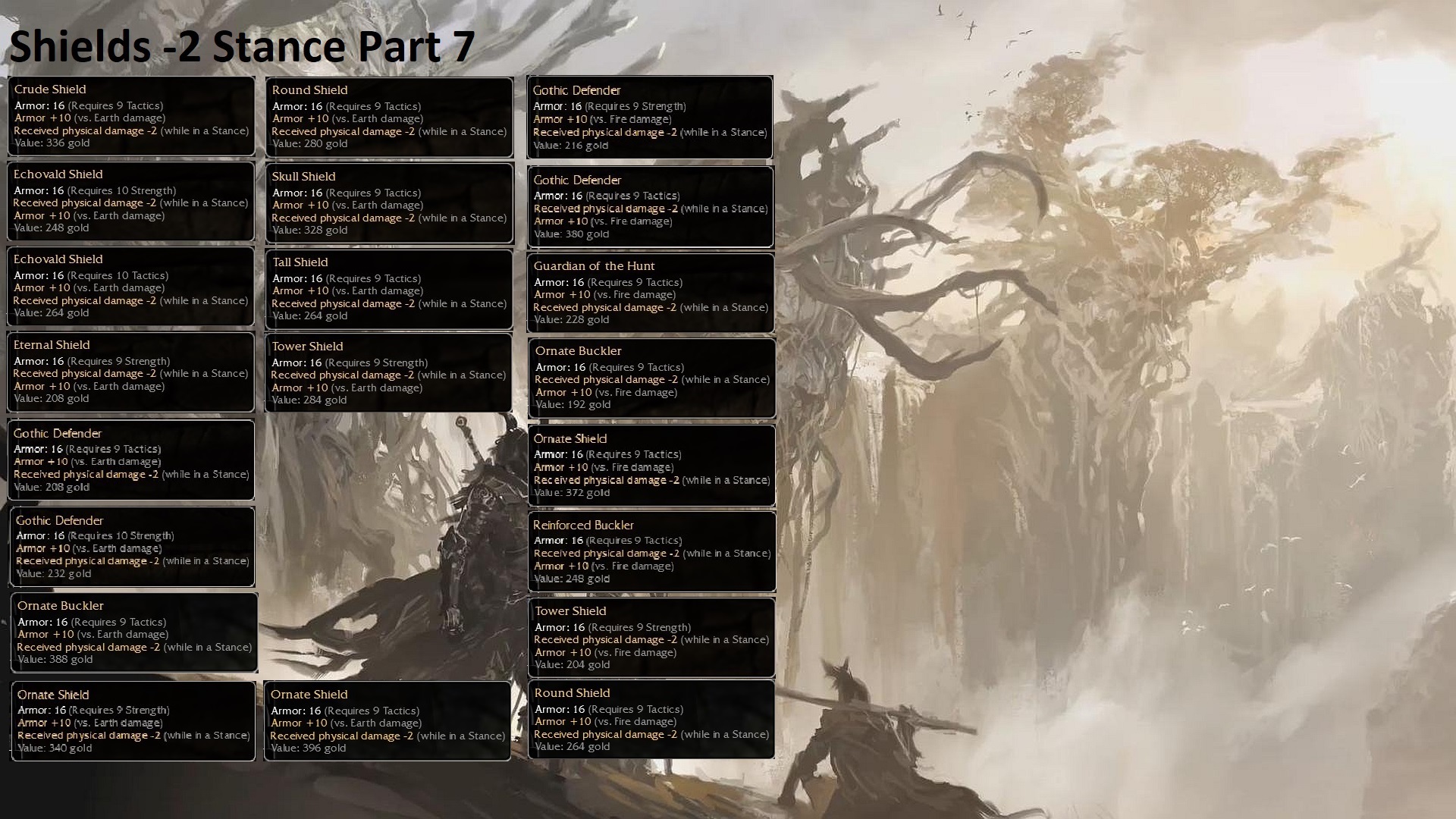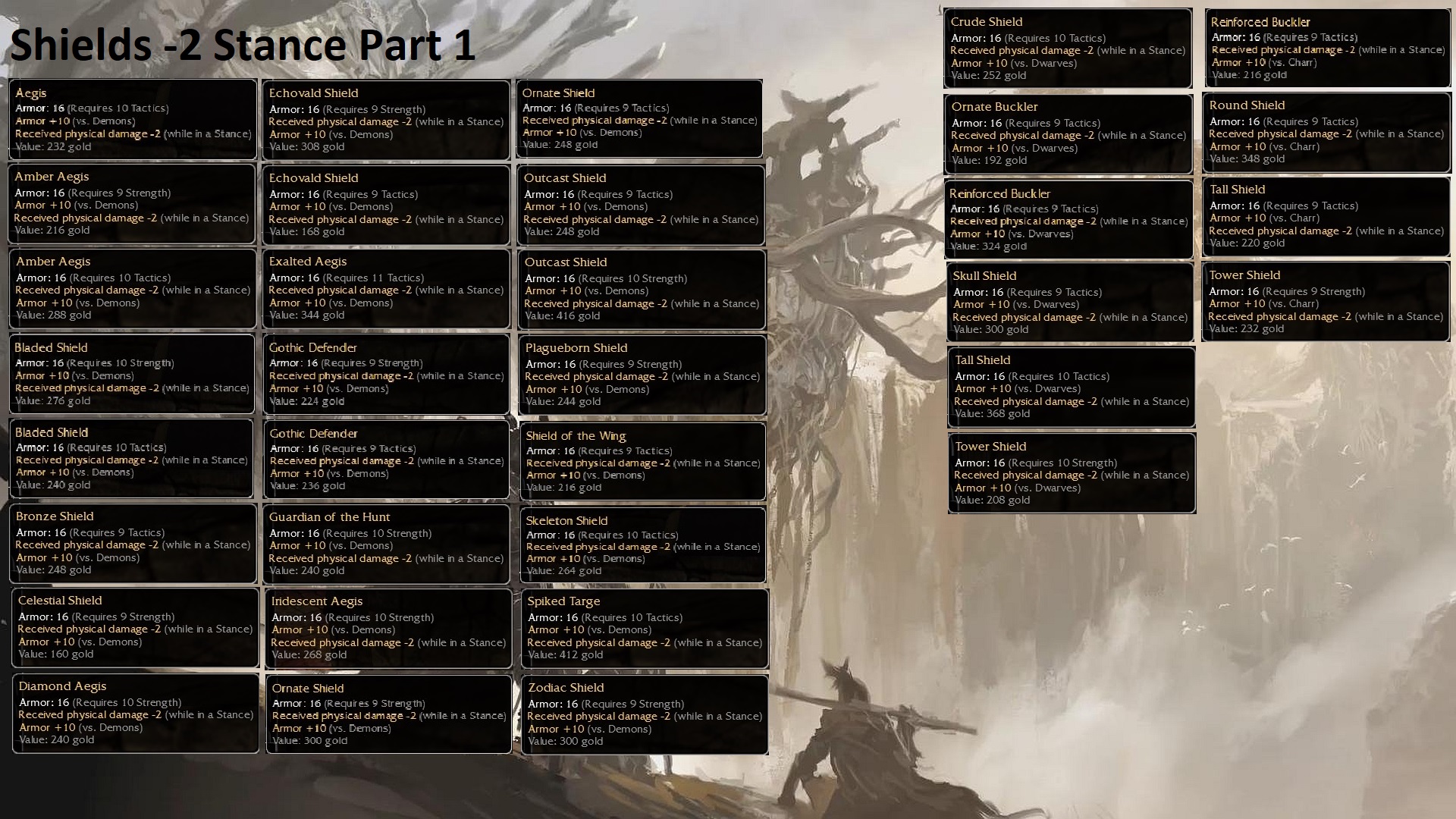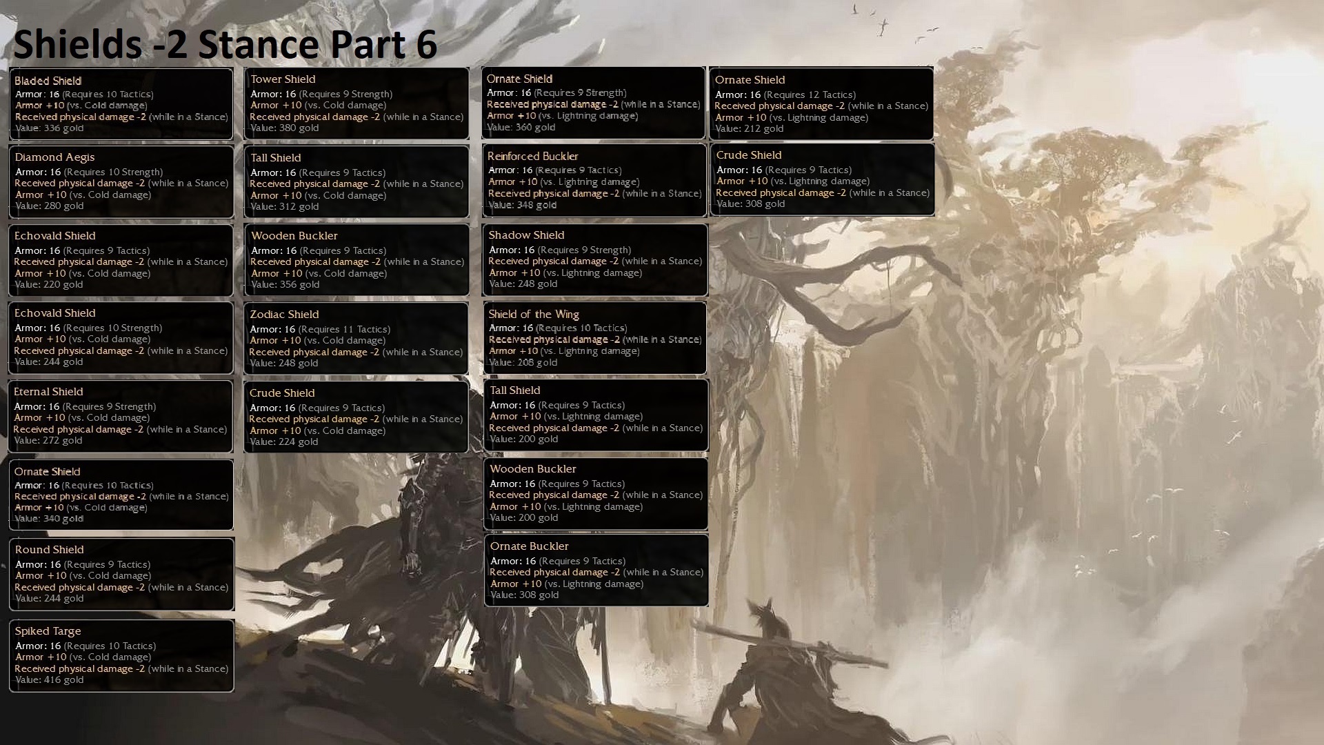 July 20, 2023 at 3:54 PM #1 Hello,Some of you ask me to see my all collection of shields, so just for your eyes -2 ENCHANT-2 STANCE+30 Hp+45 ENCHANT+45 STANCEOTHER MODSEnjoy