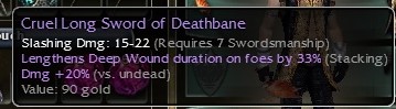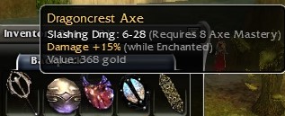 | #31 | REQ 8 ( 6-28 DAMAGE) | DRAGONCREST AXE | 15%^ENCH | GOLD | 368 GV | OS | R/B 200A | B/O - | |