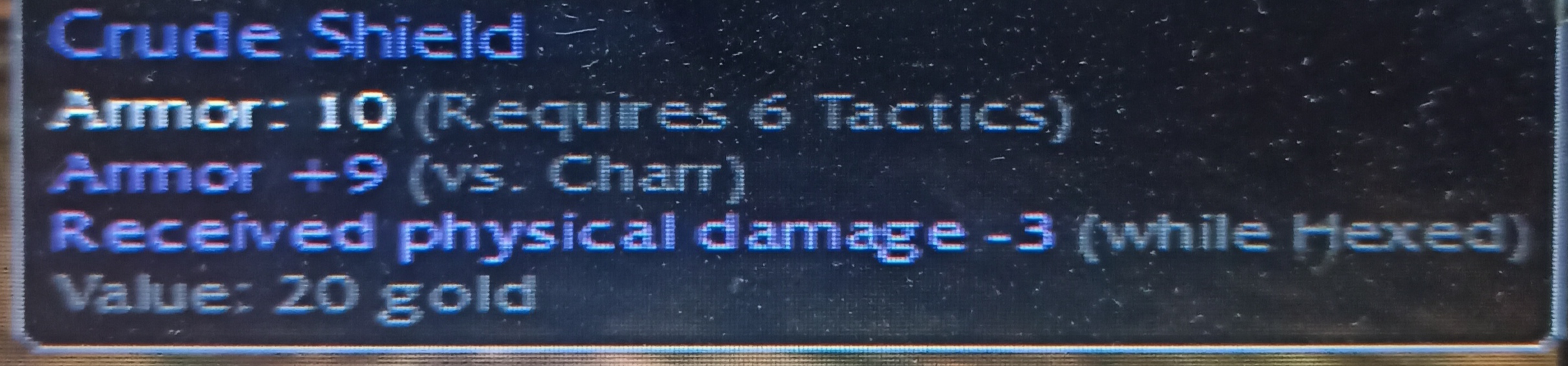 shield, any Skin, any base AR, any req, +9AR vs. Charrs / -3(Hex)