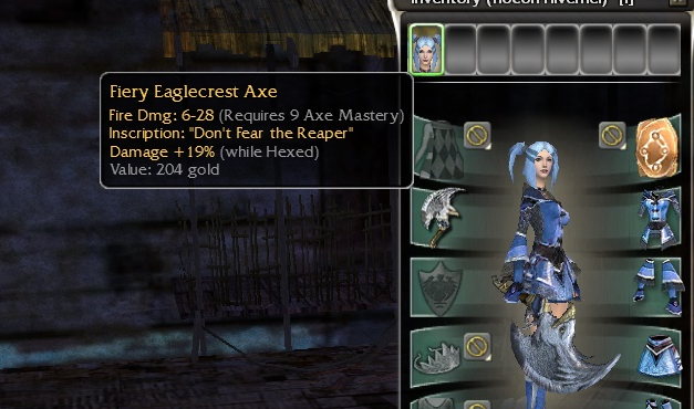 The Eaglecrest Axe is an exceptional drop; it may only drop from one dungeon end chest at a very low rate. The value of it hovers around 40a for req 9 (a stands for armbrace, and each one is worth 95-100 ecto). That alone would cover any expense you have for the rest of your play. I would recommend listing it for sale here on the forum and biding your time.