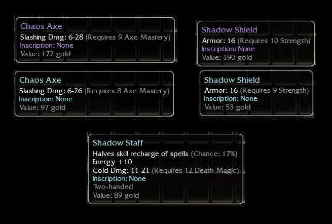 Drakes in a plain quest u can possibly get insc q8 shadow blade/shield aye.I think shadow blades/shield q9-13 drop insc same places that shadow axes tho, aye? i dont rly see big value in q9+ items tho, there just isnt interest