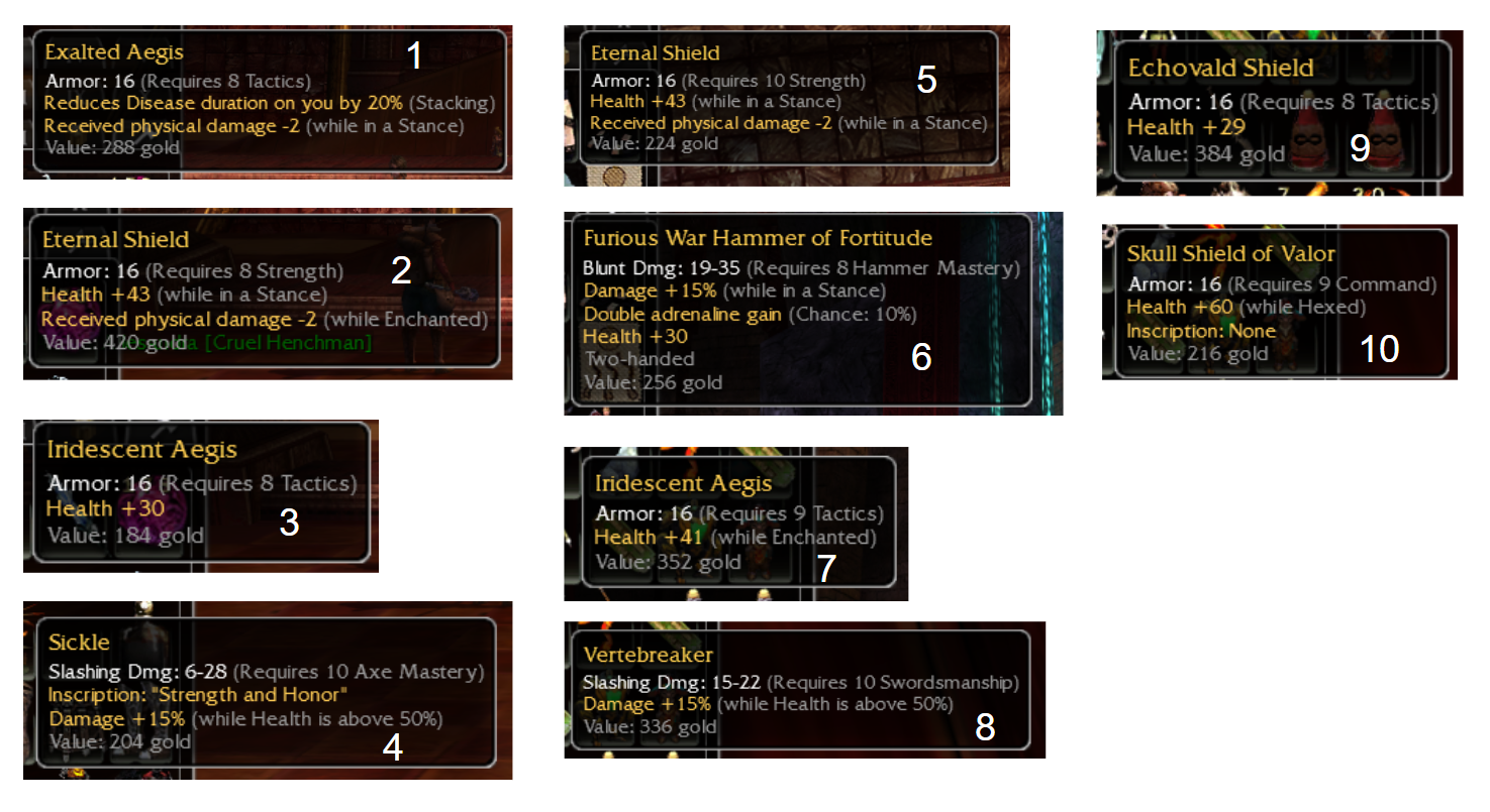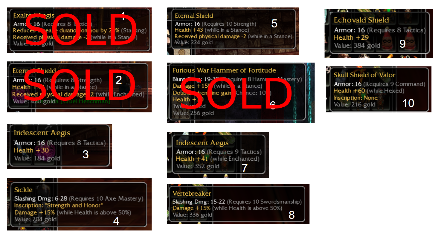 Hello All! Longtime player, first time poster. I've been playing the game since 2006 and just started to get back into the game. I have some extra items in my storage that I am looking to clear out. All items are numbered in the picture.