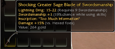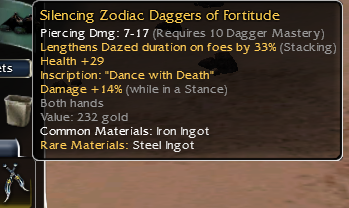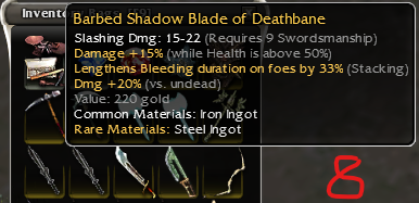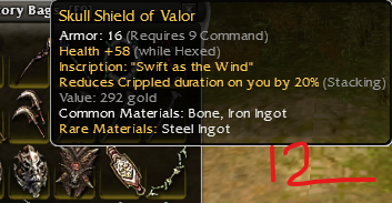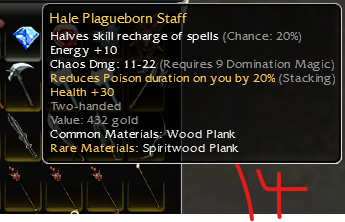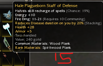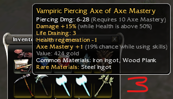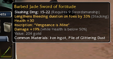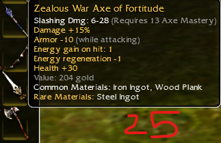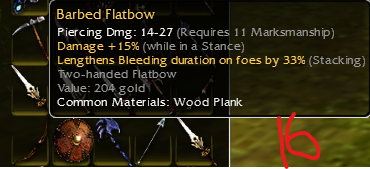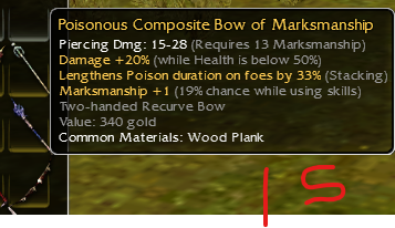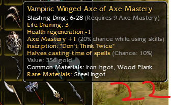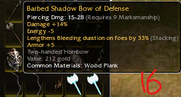 26: Vampiric shortbow of skeletonslaying; piercing dmg 15-28 q9; damage +14% while in a stance; life draining: 5, Health regeneration -1; Dmg +19% vs skeltons