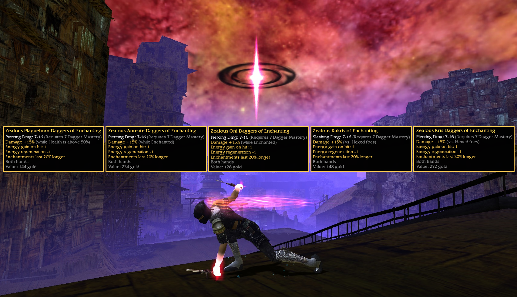 Old School pre-Nerf non-Inscription: Icy Golden Talons of Fortitude, Cold Dmg. 7-16 (req.7 dagger mastery),Damage 15% above 50%, Health+30. I have not played GW1 in 12years but back then on Auction Sites and Forums i was told by Collectors that they may possibly be one of the rarest set of Daggers in the game and possibly One of a Kind. I got them as a drop in Pre-Searing Ascalon. Gold letters not white,blue, or green.