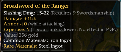r9 Broadsword of the Ranger, +5 expertise, +15%dmg armor-10 while attacking