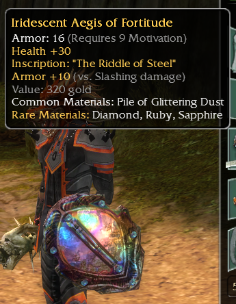 Iridescent Aegis | req 9 Motivation | +30 hp | +10 vs Slashing