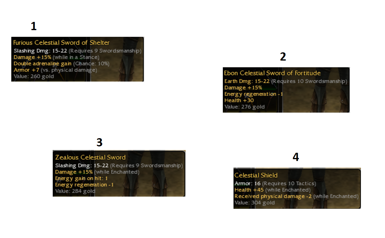 June 22, 2025 at 6:02 PM #2 Are my celestial weapons worth something?Sword q9Dmg +15% StanceSword q9Dmg +15% enchantedSword q10Dmg +15%Energy regen -1Celestial shield q10 tacticsHealth +45 (while enchanted)Received Physical Damage -2 (while enchanted)