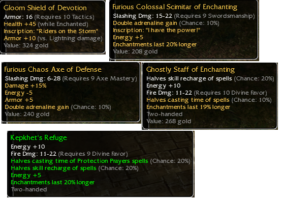 Any of these things worth much? I believe the Kepkhet's Refuge is the dark pre-nerf version. Also, the gloom shield is dyed black and chaos axe dyed green.