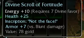 Divine Scroll of Fortitude, Energy +10, R7 Divine, Health +25, Inscription: Not The Face, Armor +7 (vs Blunt damage)