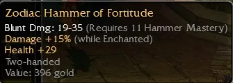 Zodiac Hammer of Fortitude, Blunt DMG 19-35, R11 Hammer, Damage +15 (while Enchanted), Health +29. Non-inscribable