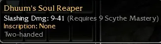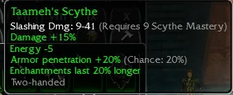 Taameh's Scythe, Slashing Dmg 9-41, R9 Scythe, Damage +15, Energy -5, Armor penetration +20 (Chance 20%), Enchants Last 20% longer