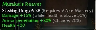 Murakai's Reaver, Slashing Dmg 6-28, R9 Axe, Damage +15 (While health is above 50%), Armor penetration +20 (Chance 20%), Health +30