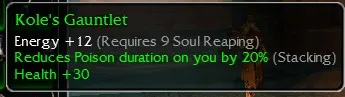Kole's Gauntlet, Energy +12, R9 Soul, Reduces Poision duarion by 20% (Stacking), Health +30
