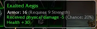 Exalted Aegis, Armor 16, R9 Strength, Received Physical dmg -5 (Chance 20%), Health +30