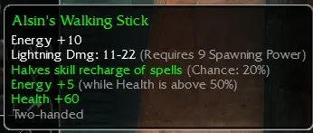 Alsin's Walking Stick, Energy +10, Lightning Dmg 11-22, R9 Spawning, Halves Skill recharge (Chance 20%), Energy +5 (while Health is above 50%), Health +60