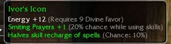 Ivor's Icon, Energy +12, R9 Divine, Smiting Prayers +1 (20% Chance while using skills), Halves recharge (Chance 10%)