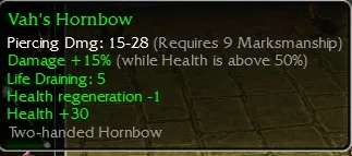 Vah's Hornbow, Piercing Dmg 15-28, R9 Marksmanship, Damage +15 (while Health is above 50%), Life Draining: 5, Health regen -1, Health +30