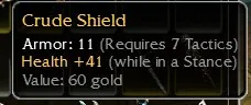 Crude Shield, Armor 11, R7 Tactics, Health +41 (while In a stance). Non-inscribable