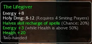 The Lifegiver Energy +8, Holy Dmg 9-12, R4 Smiting, Halves skill recharge (Chance 20%), Energy +3 (while Health is above 50%), Health +20