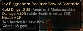 Icy Plagueborn Rescurve Bow of Fortitude, Cold Dmg 13-15, R8 Marksmanship, Damage +20 (while health is blow 50%), Health +29. Non-inscribable