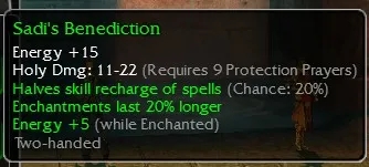 Sadi's Benediction, Energy +15, Holy Dmg 11-22, R9 Prot, Halves skill recharge (Chance 20%), Enchants last 20% longer, Energy +5 (while Enchanted)