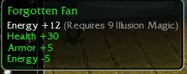 Forgotten Fan, Energy +12, R9 Illusion, Health +30, Armor +5, Energy -5