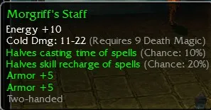 Morgriff's Staf, Energy +10, Cold Dmg 11-22, R9 Death, Halves Casting time (Chance 10%), Halves Skill recharge (Chance 20%), Armor +5, Armor +5