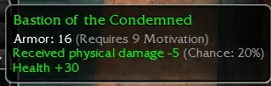 Bastion of the Condemned, Armor 16, R9 Motivation, Received physical damage -5 (Chance 20%), Health +30