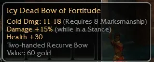 Icy Dead Bow of Fortitude, Cold Dmg 11-18, R8 Marksmanship, Damage +15% (While in a stance), Health +30. Non-inscribable
