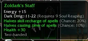 Zoldark's Staff, Energy +15, Dark Dmg 11-22, R9 Soul, Halves skill recharge (Chance 20%), Halves casting time (Chance 10%), Health +30