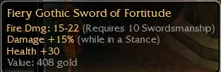Fiery Gothic Sword of Fortitude, Fire Dmg 15-22, R10, Damage +15 (while In a stance), Health +30. Non-inscribable