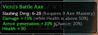Victo's Battle Axe, Slashing Dmg 6-28, R9 Axe, Damage +15 (While Health is above 50%), Armor penetration +20 (Chance 20%), Health +30