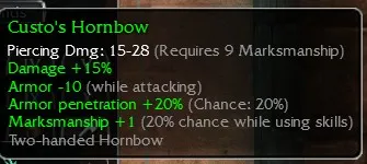 Custo's Hornbow 15-18, R9 Marksmanship, Damage +15, Armor -10 (while attacking), Armor penetration +20 (Chance: 20%), Marksmanship +1 (20% chance whilst using skills)