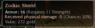 Zodiac Shield, Armor 16. R11 Strength, Received physical damage -5 (Chance 20%). Non-inscribable